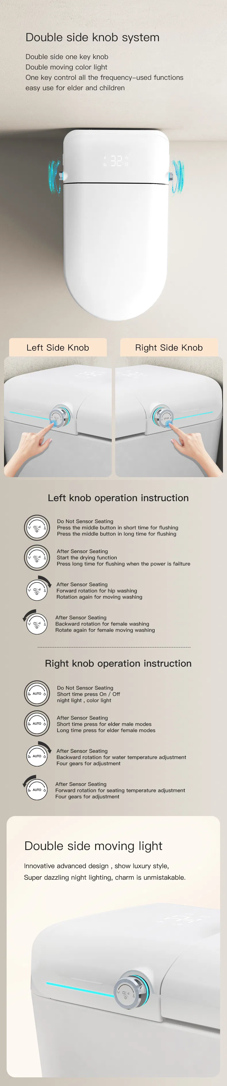 It offers multiple control methods including a remote control, one-key side knob, induction (auto-open), and digital display for easy operation.